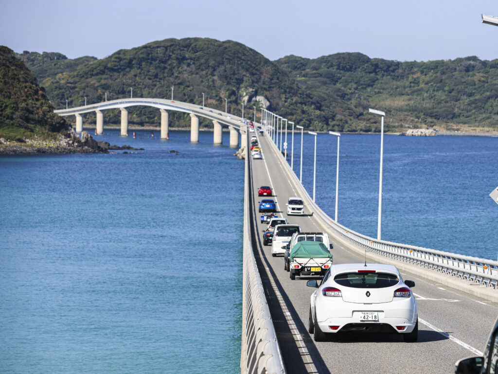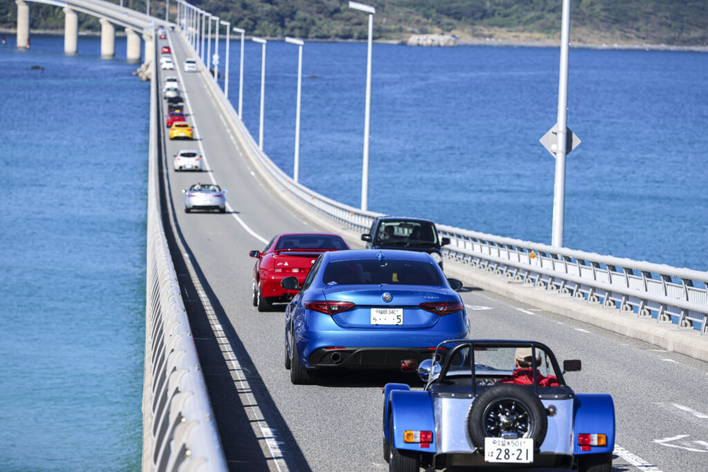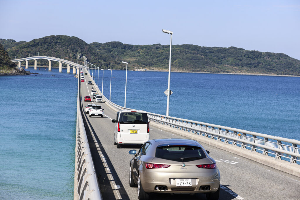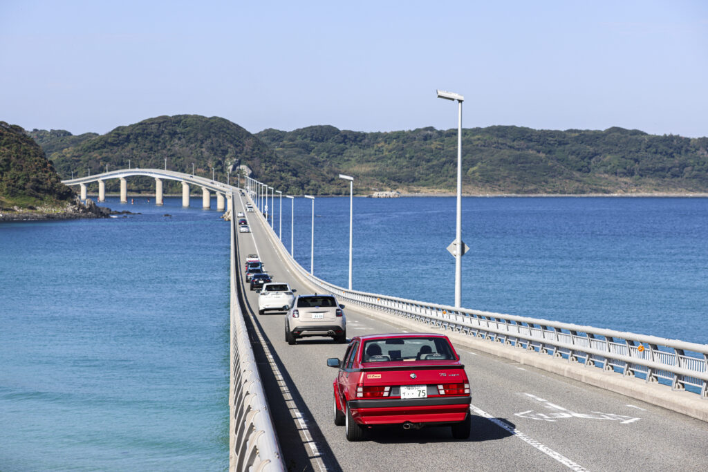 沖縄の海を思わせるような青さの中、角島大橋を駆けて行く色とりどりの参加車両が実に素敵に輝いています。