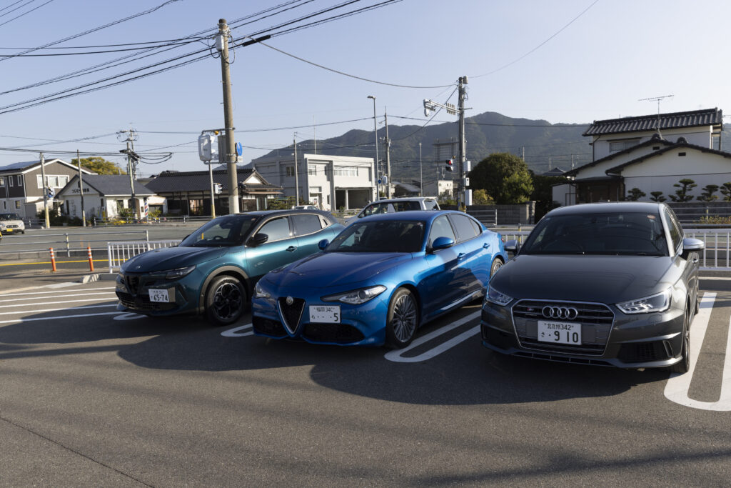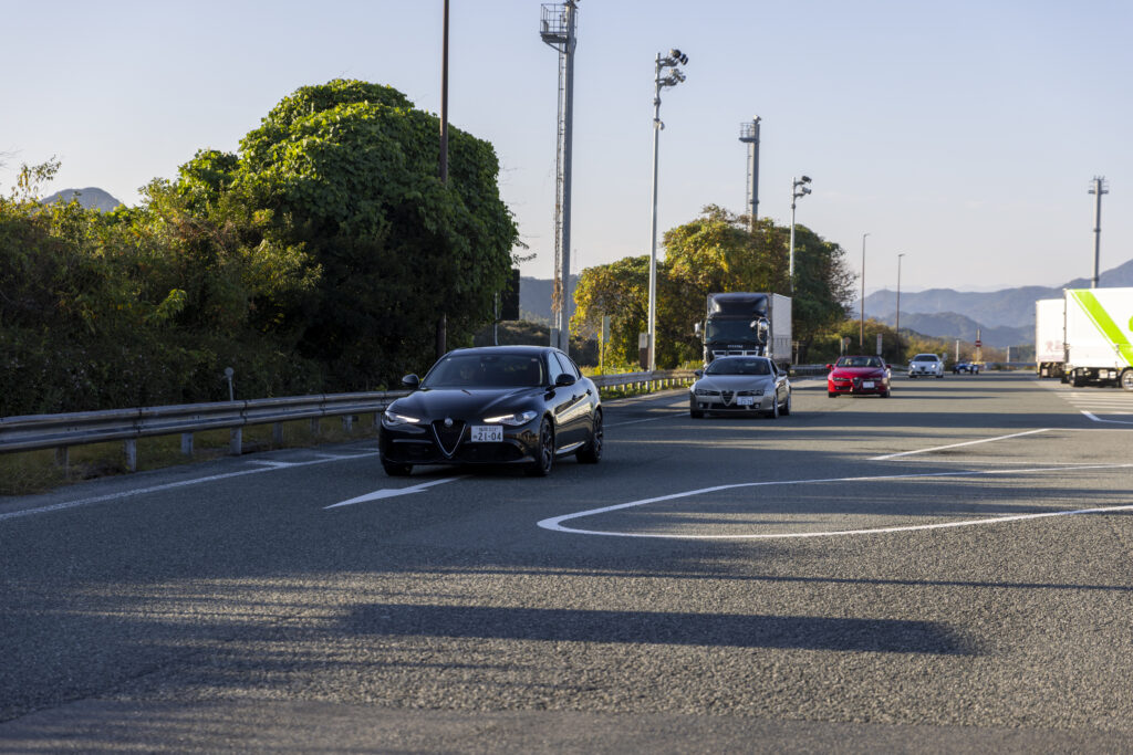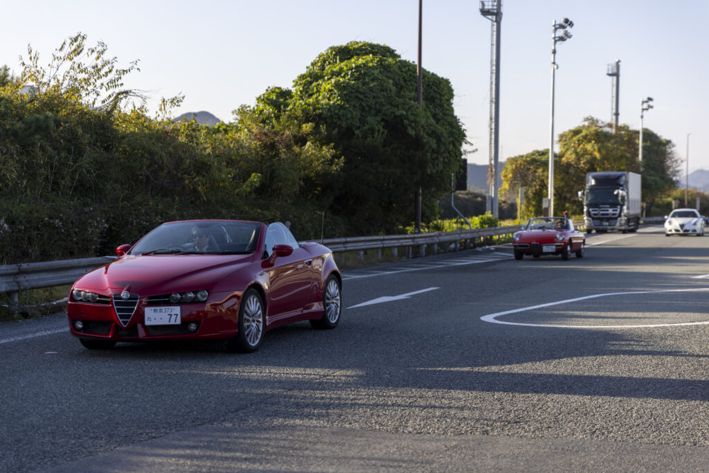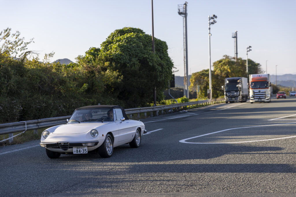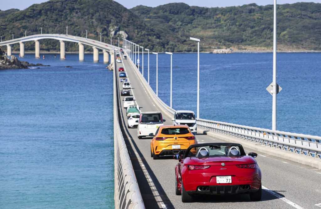 沖縄の海を思わせるような青さの中、角島大橋を駆けて行く色とりどりの参加車両が実に素敵に輝いています。